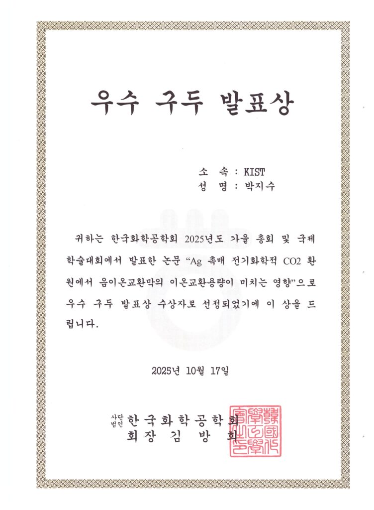 Jisoo received the Best Oral Presentation Award at the 2025 KIChE Fall Meeting! Congratulations on this recognition of your dedication and effort. Wishing her continued success in future research pursuits. Very much well-deserved! 🥳